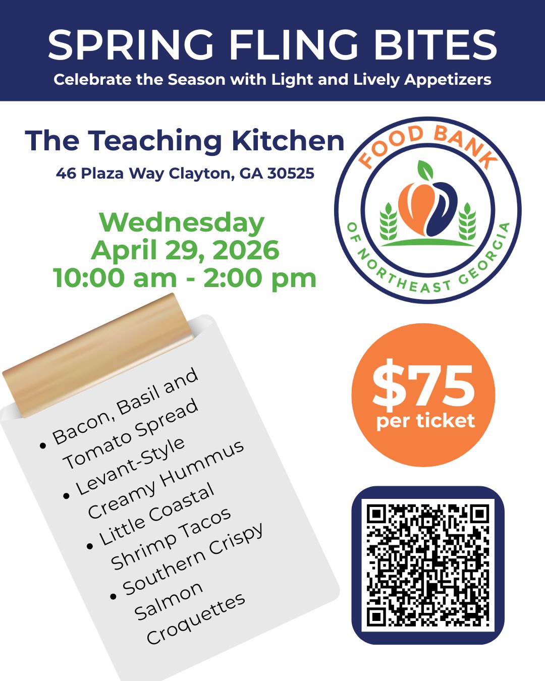 Spring Fling Bites, Celebrate the season with Light and Lively Appetizers at The Teaching Kitchen, 46 Plaza Way, Clayton, GA, 30525 Wednesday April 29, 2026 10 am to 2 pm